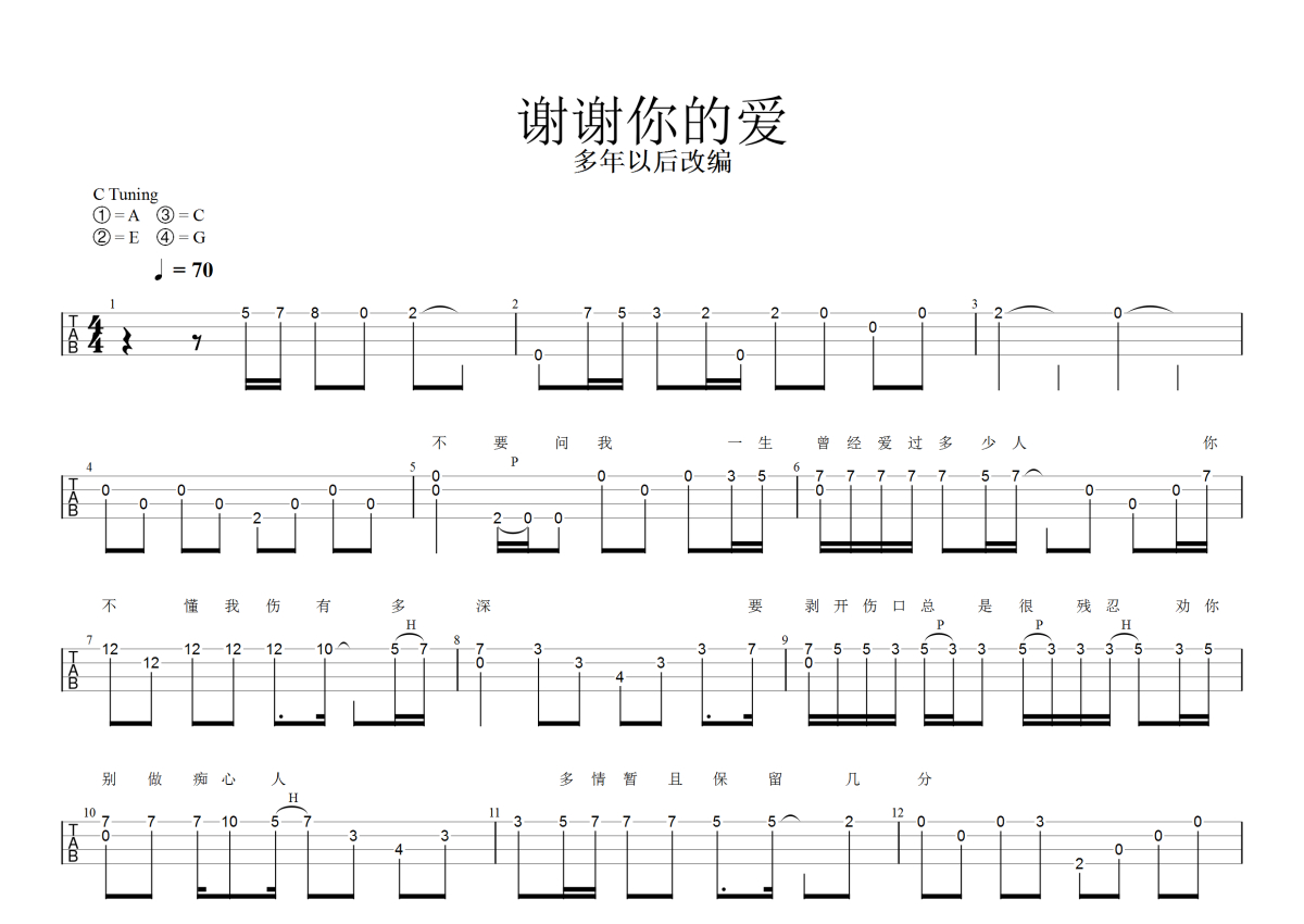《谢谢你的爱》是刘德华演唱的一首歌曲,指弹,本尤克里里谱采用的是C调指法编配,这份尤克里里谱共有两张高清图谱,图谱由 @大狼指弹 编配上传,图谱使用四线谱编配,包含尤克里里和弦指法、简谱以及歌词部分,曲谱配备了相关的音频提供试听,使用这份谢谢你的爱尤克里里谱,可以让你更加方便地掌握这首歌曲的弹唱技巧,快来尝试吧。刘德华《谢谢你的爱》_C调尤克里里谱_指弹。