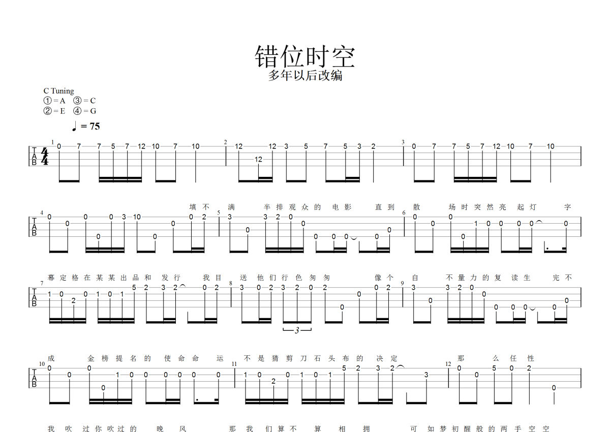《错位时空》是艾辰演唱的一首歌曲,指弹,本尤克里里谱采用的是C调指法编配,这份尤克里里谱共有两张高清图谱,图谱由 @大狼指弹 编配上传,图谱使用四线谱编配,包含尤克里里和弦指法、简谱以及歌词部分,曲谱配备了相关的音频提供试听,使用这份错位时空尤克里里谱,可以让你更加方便地掌握这首歌曲的弹唱技巧,快来尝试吧。艾辰《错位时空》_C调尤克里里谱_指弹。