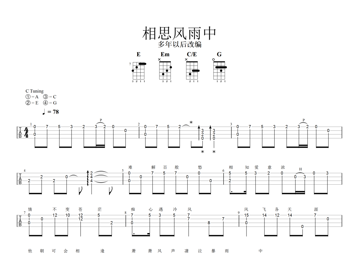 《相思风雨中》是张学友演唱的一首歌曲,指弹,本尤克里里谱采用的是C调指法编配,这份尤克里里谱共有两张高清图谱,图谱由 @大狼指弹 编配上传,图谱使用四线谱编配,包含尤克里里和弦指法、简谱以及歌词部分,曲谱配备了相关的音频提供试听,使用这份相思风雨中尤克里里谱,可以让你更加方便地掌握这首歌曲的弹唱技巧,快来尝试吧。张学友《相思风雨中》尤克里里谱,采用C调指法编配指弹,多年以后编配出品,共有2张高清图谱,免翻页排版设计。