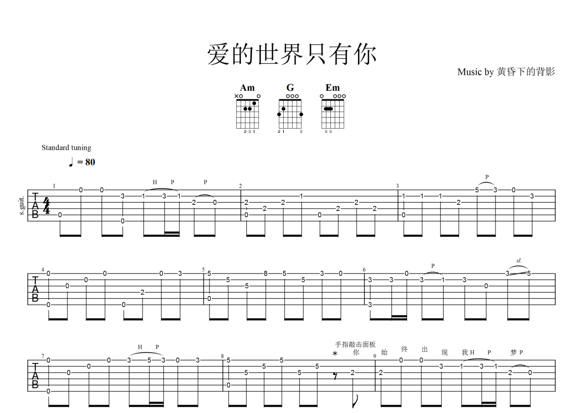 《爱的世界只有你》是祁隆演唱的一首歌曲,指弹,本吉他谱采用的是C调指法编配,这份吉他谱共有三张高清图谱,图谱由 @大狼指弹 编配上传,图谱使用六线谱编配,曲谱配备了相关的音频提供试听,使用这份爱的世界只有你吉他谱,可以让你更加方便地掌握这首歌曲的演奏技巧,快来尝试吧。祁隆《爱的世界只有你》吉他独奏谱,采用C调指法编配指弹,多年以后编配出品,共有3张高清图谱。