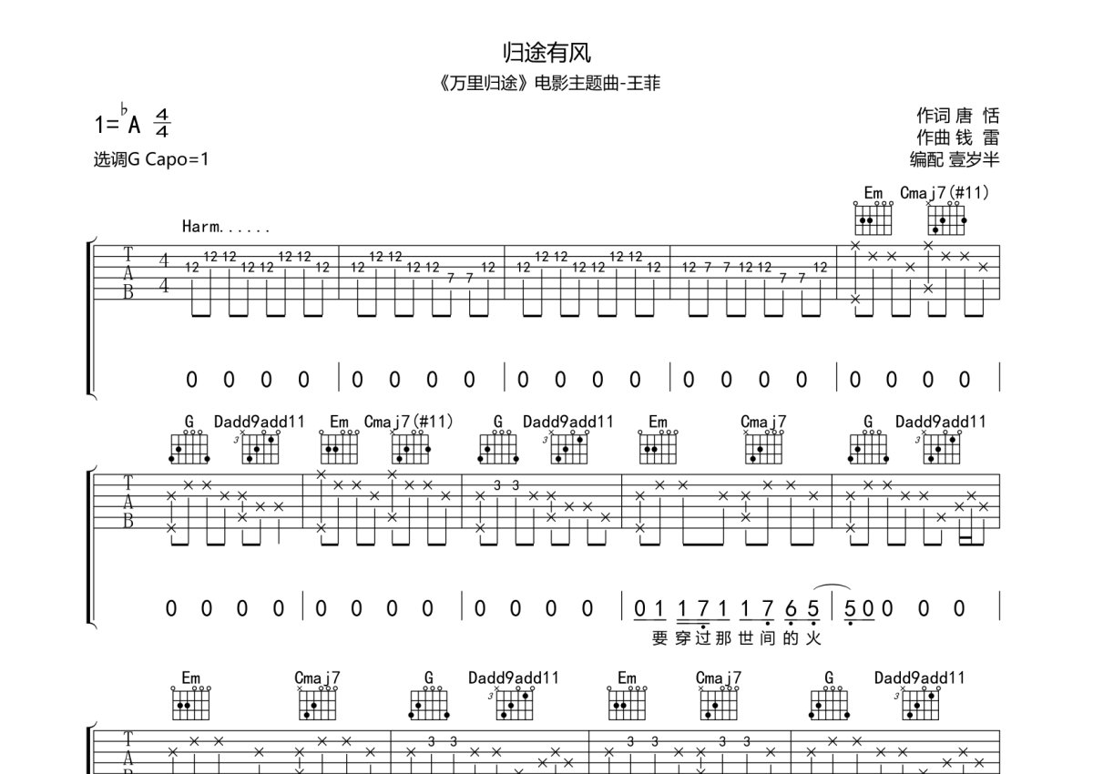 王菲《归途有风》吉他谱 - G调弹唱六线谱