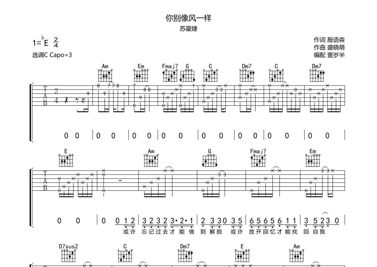 《你别像风一样》是苏星婕演唱的一首歌曲,本吉他谱采用的是C调指法编配,这份吉他谱共有三张高清图谱,图谱由 @壹岁半 编配上传,图谱使用六线谱编配,包含吉他和弦指法、简谱以及歌词部分,曲谱配备了相关的音频提供试听,使用这份你别像风一样吉他谱,可以让你更加方便地掌握这首歌曲的弹唱技巧,快来尝试吧。苏星婕《你别像风一样》吉他弹唱谱,采用C调指法编配,壹岁半编配出品,共有3张高清图谱。