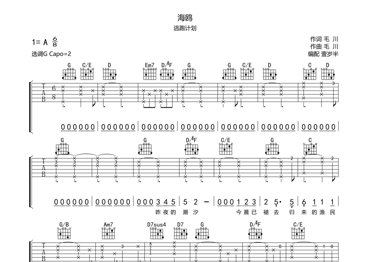 逃跑计划《海鸥》吉他谱 - G调弹唱六线谱
