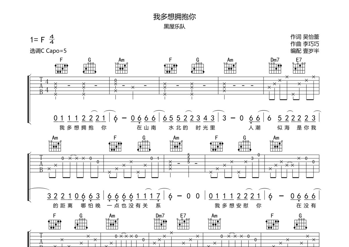 《我多想拥抱你》是黑屋乐队演唱的一首歌曲,本吉他谱采用的是C调指法编配,这份吉他谱共有三张高清图谱,图谱由 @壹岁半 编配上传,图谱使用六线谱编配,包含吉他和弦指法、简谱以及歌词部分,曲谱配备了相关的音频提供试听,使用这份我多想拥抱你吉他谱,可以让你更加方便地掌握这首歌曲的弹唱技巧,快来尝试吧。黑屋乐队《我多想拥抱你》吉他弹唱谱,采用C调指法编配,壹岁半编配出品,共有3张高清图谱。