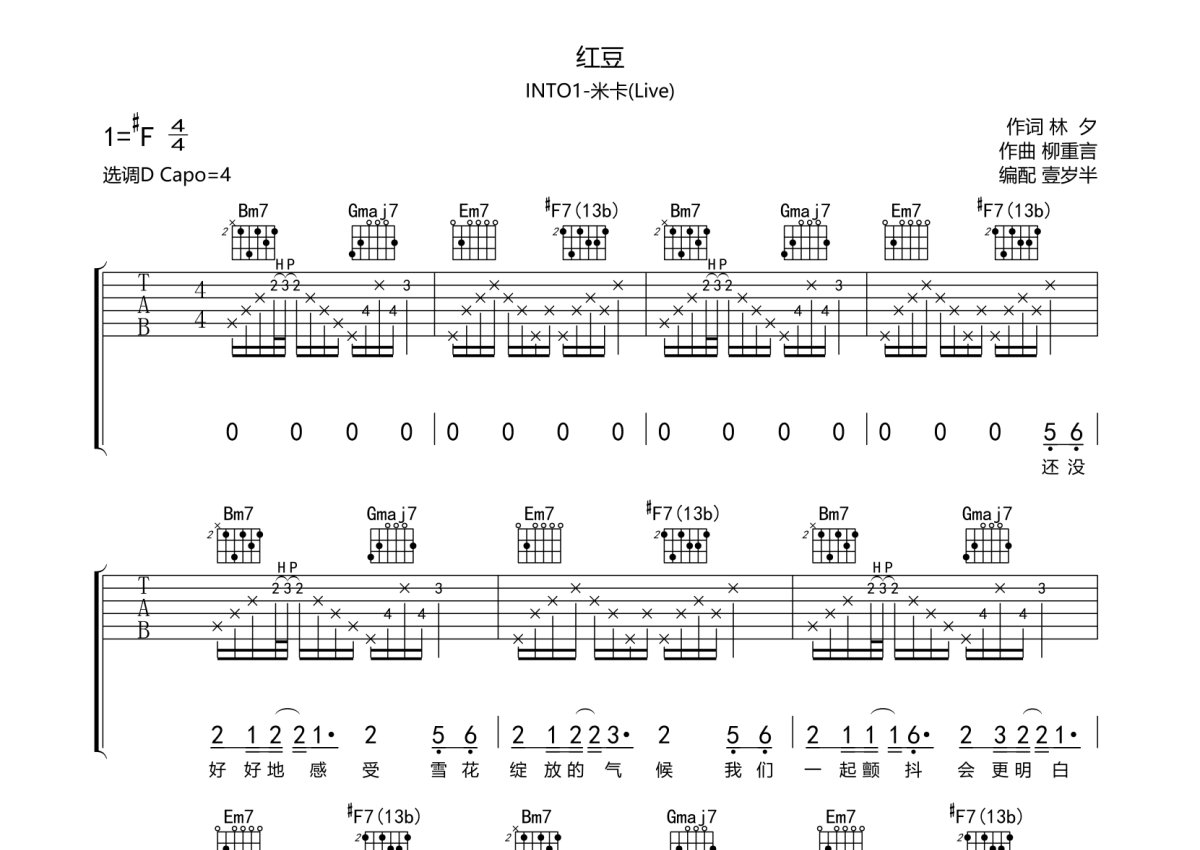 INTO1-米卡《红豆》吉他谱 - D调弹唱六线谱