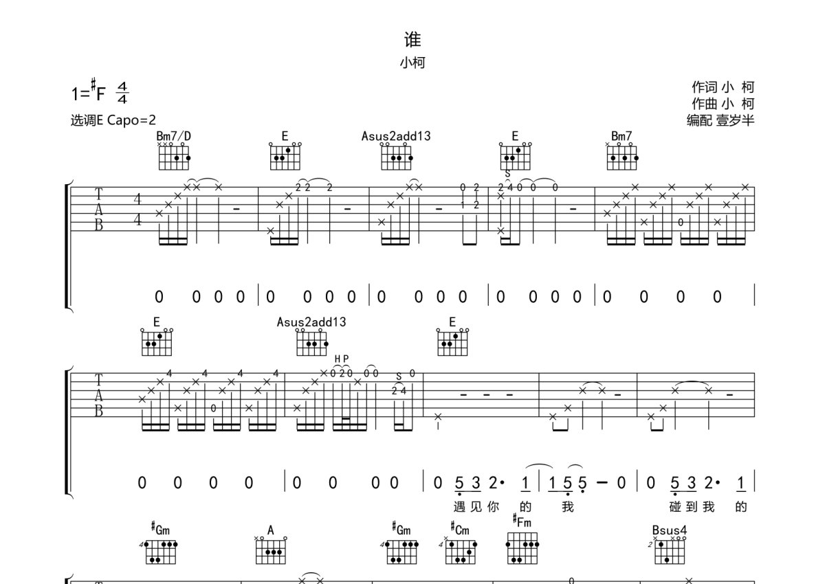 小柯《谁》吉他谱 - E调弹唱六线谱