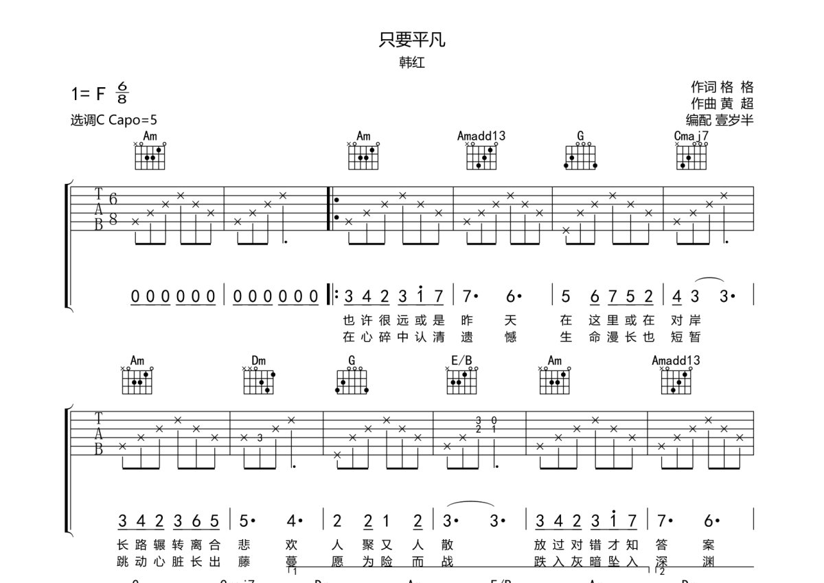 《只要平凡》是韩红演唱的一首歌曲,本吉他谱采用的是C调指法编配,这份吉他谱共有三张高清图谱,图谱由 @壹岁半 编配上传,图谱使用六线谱编配,包含吉他和弦指法、简谱以及歌词部分,曲谱配备了相关的音频提供试听,使用这份只要平凡吉他谱,可以让你更加方便地掌握这首歌曲的弹唱技巧,快来尝试吧。韩红《只要平凡》吉他弹唱谱,采用C调指法编配,壹岁半编配出品,共有3张高清图谱。