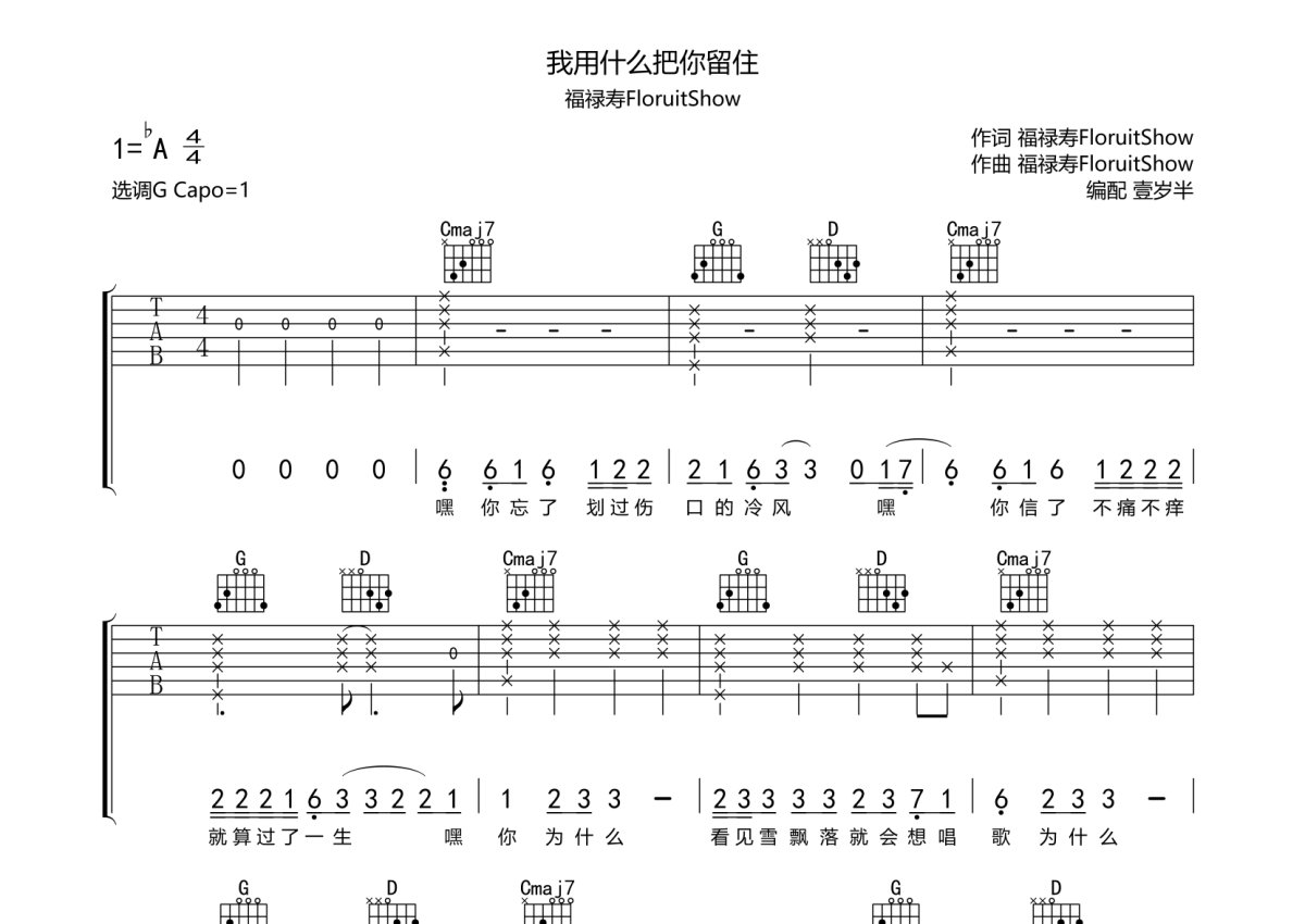 福禄寿FloruitShow《我用什么把你留住》吉他谱 - G调弹唱六线谱