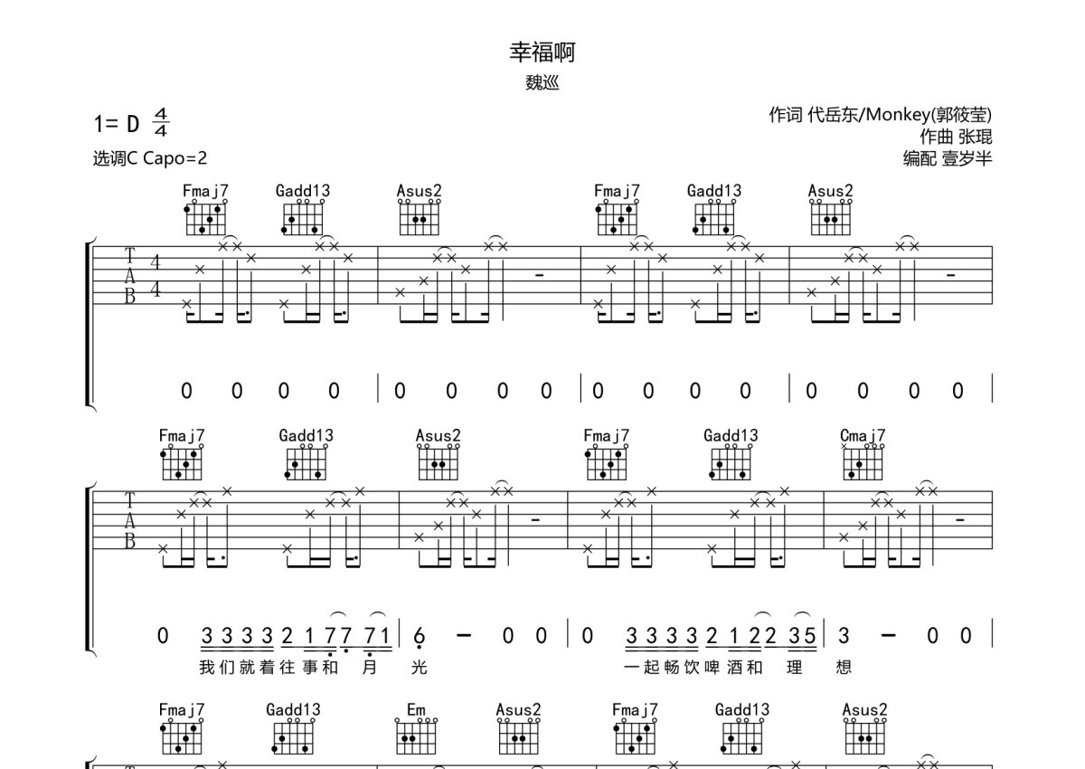 《幸福啊》是魏巡演唱的一首歌曲,本吉他谱采用的是C调指法编配,这份吉他谱共有三张高清图谱,图谱由 @壹岁半 编配上传,图谱使用六线谱编配,包含吉他和弦指法、简谱以及歌词部分,曲谱配备了相关的音频提供试听,使用这份幸福啊吉他谱,可以让你更加方便地掌握这首歌曲的弹唱技巧,快来尝试吧。魏巡《幸福啊》吉他弹唱谱,采用C调指法编配,壹岁半编配出品,共有3张高清图谱。