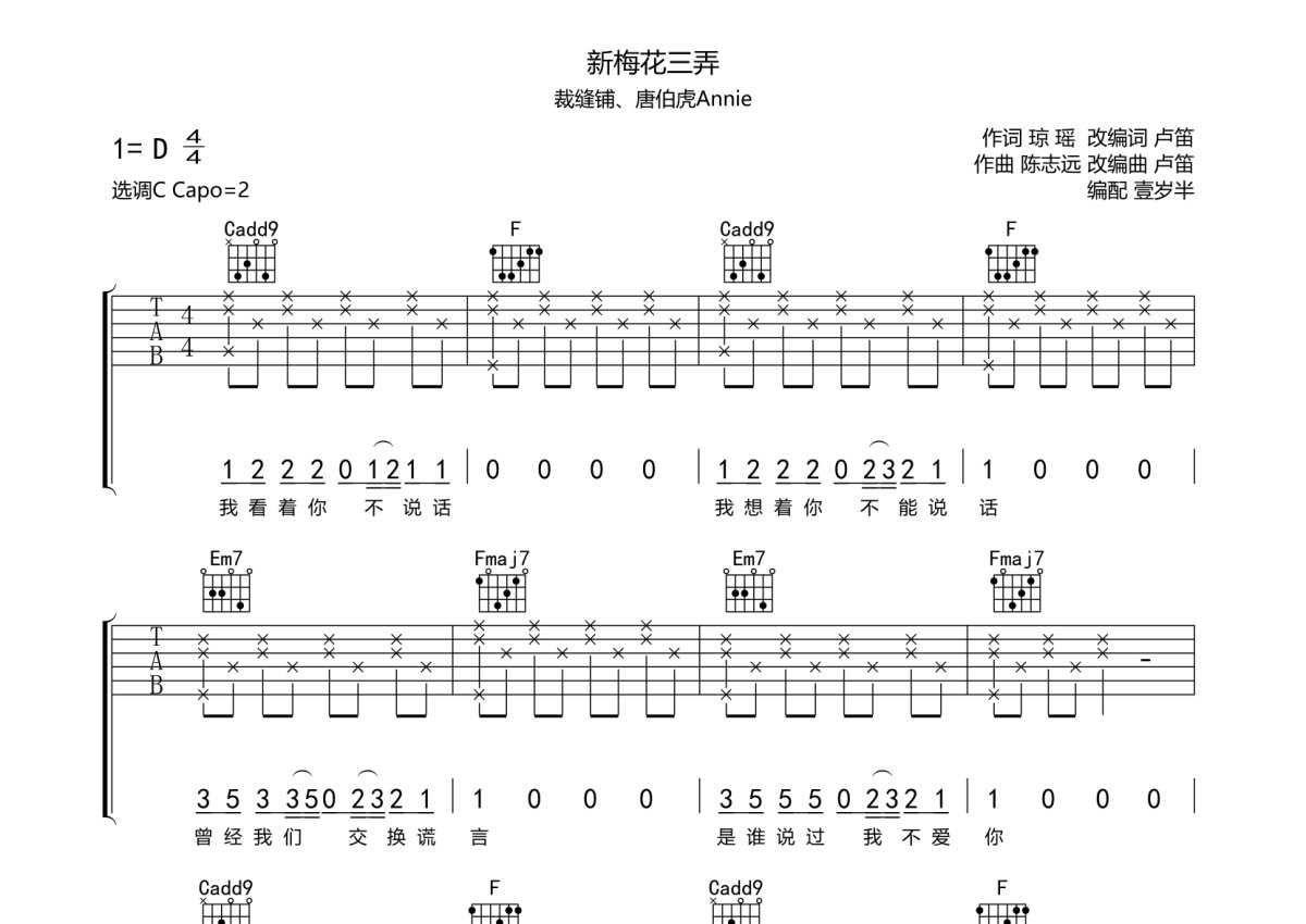 裁缝铺、唐伯虎《新梅花三弄》吉他谱 - C调弹唱六线谱