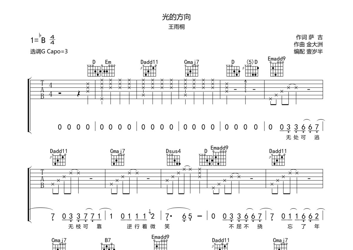 王雨桐《光的方向》吉他谱 - G调弹唱六线谱