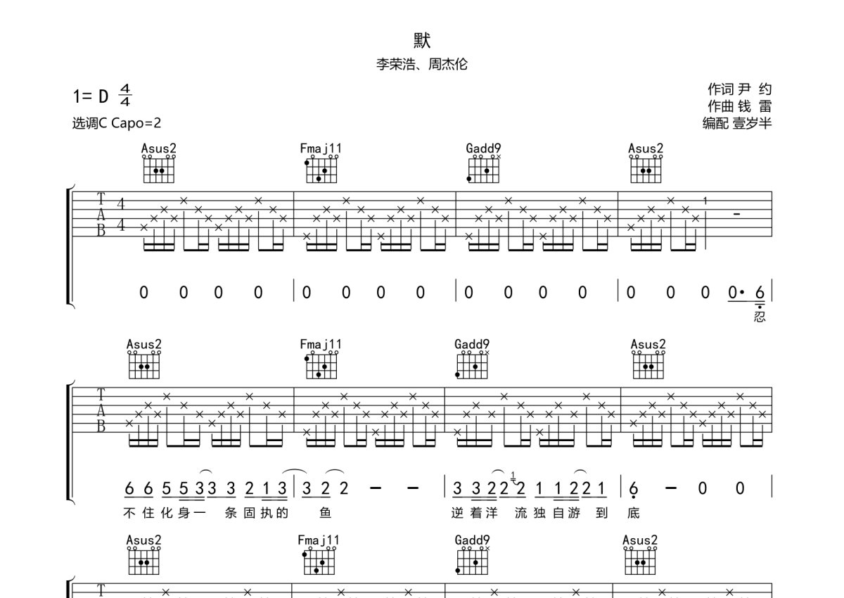 李荣浩、周杰伦《默》吉他谱 - C调弹唱六线谱