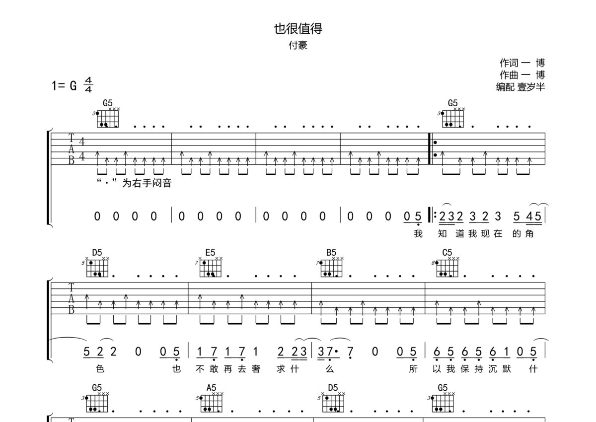 付豪《也很值得》吉他谱 - G调弹唱六线谱