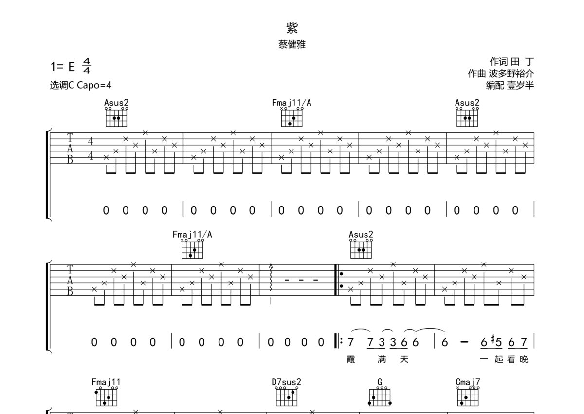 《紫》是蔡健雅演唱的一首歌曲,本吉他谱采用的是C调指法编配,这份吉他谱共有三张高清图谱,图谱由 @壹岁半 编配上传,图谱使用六线谱编配,包含吉他和弦指法、简谱以及歌词部分,曲谱配备了相关的音频提供试听,使用这份紫吉他谱,可以让你更加方便地掌握这首歌曲的弹唱技巧,快来尝试吧。蔡健雅《紫》吉他弹唱谱,采用C调指法编配,壹岁半编配出品,共有3张高清图谱。