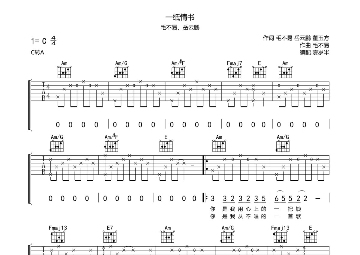 毛不易、岳云鹏《一纸情书》吉他谱 - C调弹唱六线谱