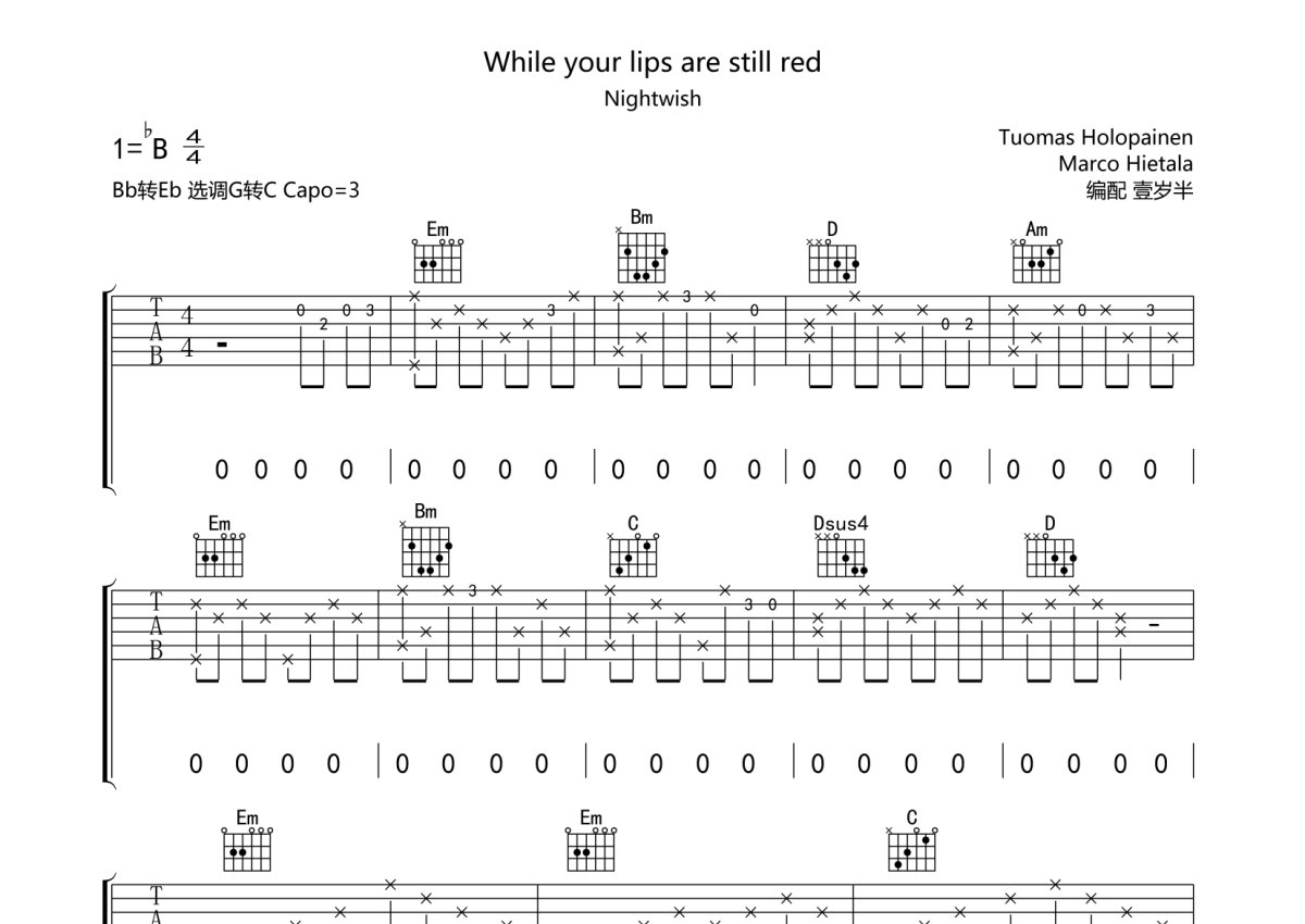 《While your lips are still red》是Nightwish演唱的一首歌曲,本吉他谱采用的是G调指法编配,这份吉他谱共有六张高清图谱,图谱由 @壹岁半 编配上传,图谱使用六线谱编配,包含吉他和弦指法、简谱以及歌词部分,曲谱配备了相关的音频提供试听,使用这份While your lips are still red吉他谱,可以让你更加方便地掌握这首歌曲的弹唱技巧,快来尝试吧。附间奏和尾奏Solo。