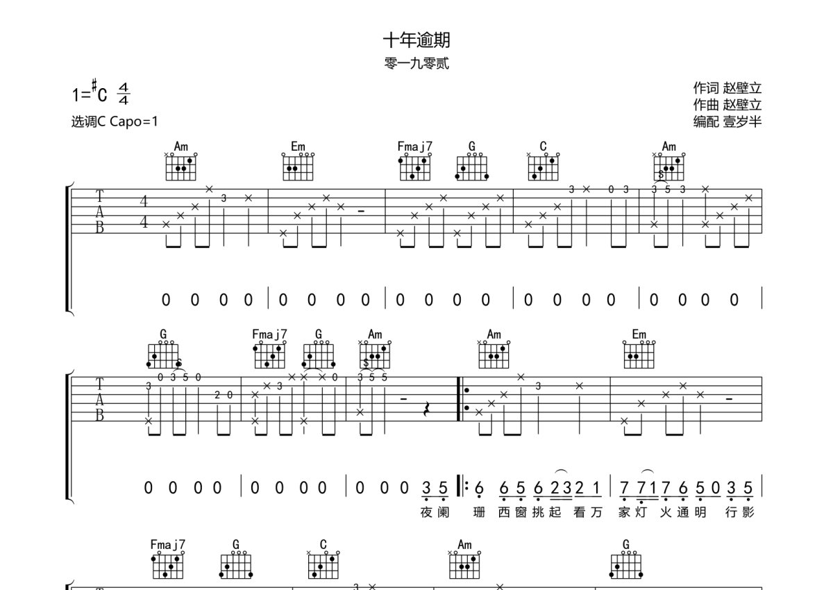 零一九零贰《十年逾期》吉他谱 - C调弹唱六线谱