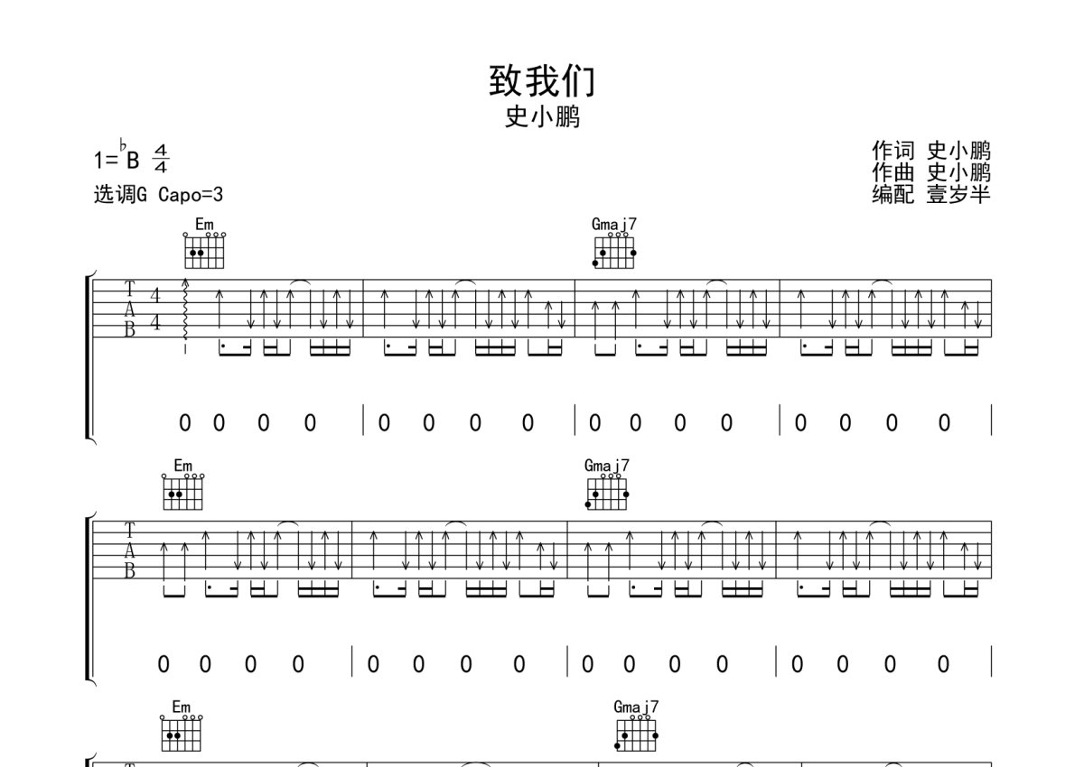 《致我们》是史小鹏演唱的一首歌曲,本吉他谱采用的是G调指法编配,这份吉他谱共有四张高清图谱,图谱由 @壹岁半 编配上传,图谱使用六线谱编配,包含吉他和弦指法、简谱以及歌词部分,使用这份致我们吉他谱,可以让你更加方便地掌握这首歌曲的弹唱技巧,快来尝试吧。史小鹏《致我们》吉他弹唱谱,采用G调指法编配,壹岁半编配出品,共有4张高清图谱。