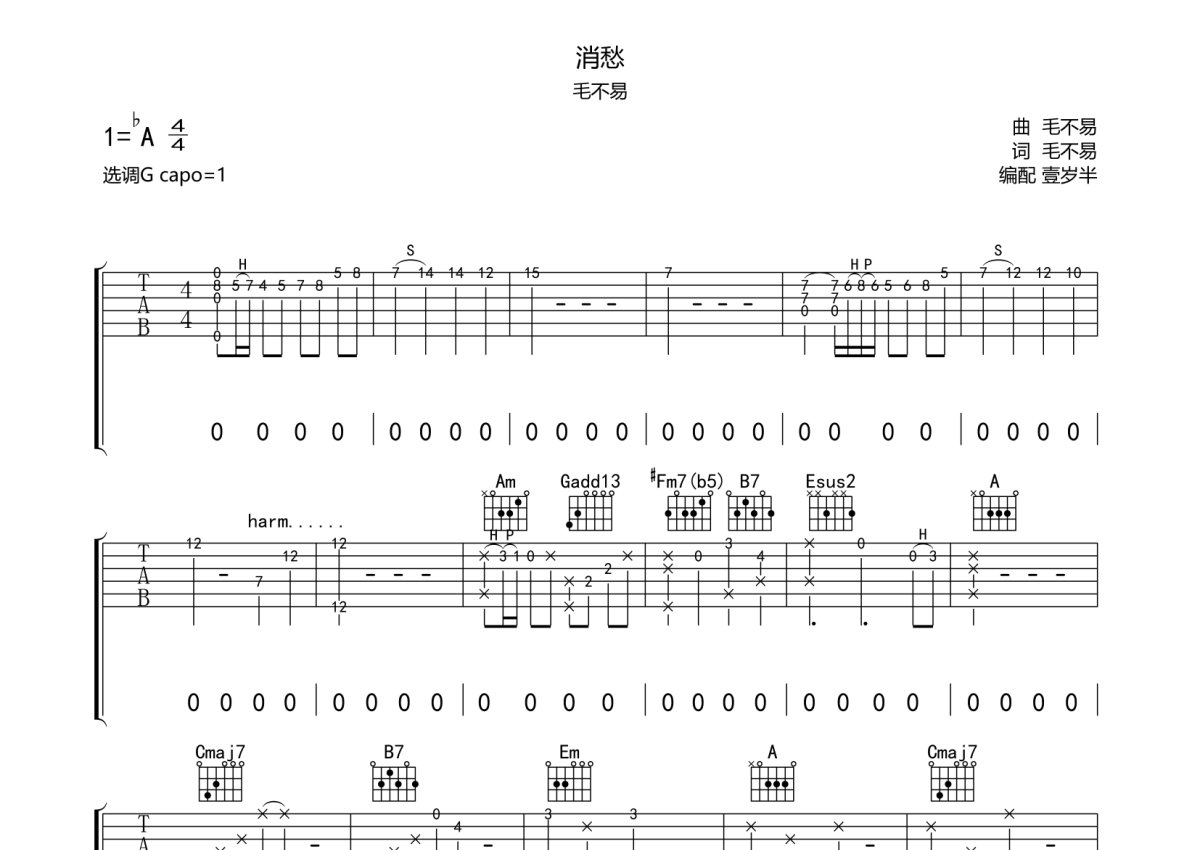毛不易《消愁》吉他谱 - G调弹唱六线谱