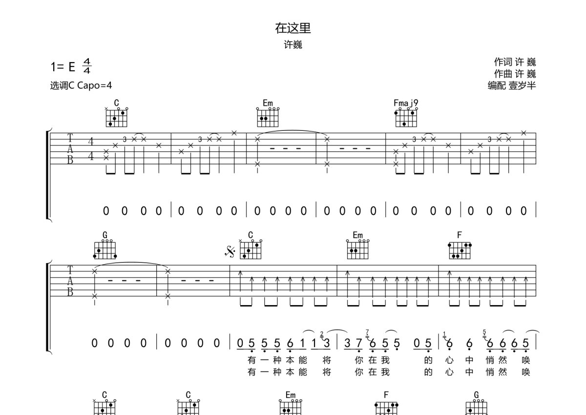 《在这里》是许巍演唱的一首歌曲,本吉他谱采用的是C调指法编配,这份吉他谱共有四张高清图谱,图谱由 @壹岁半 编配上传,图谱使用六线谱编配,包含吉他和弦指法、简谱以及歌词部分,使用这份在这里吉他谱,可以让你更加方便地掌握这首歌曲的弹唱技巧,快来尝试吧。许巍《在这里》吉他弹唱谱,采用C调指法编配,壹岁半编配出品,共有4张高清图谱。