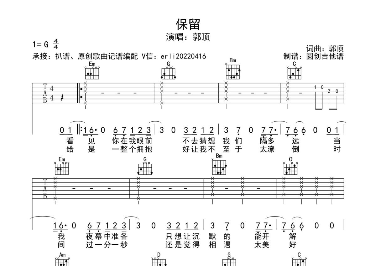 郭顶《保留》吉他谱 - G调弹唱六线谱 - 分解加扫弦编配原版编配