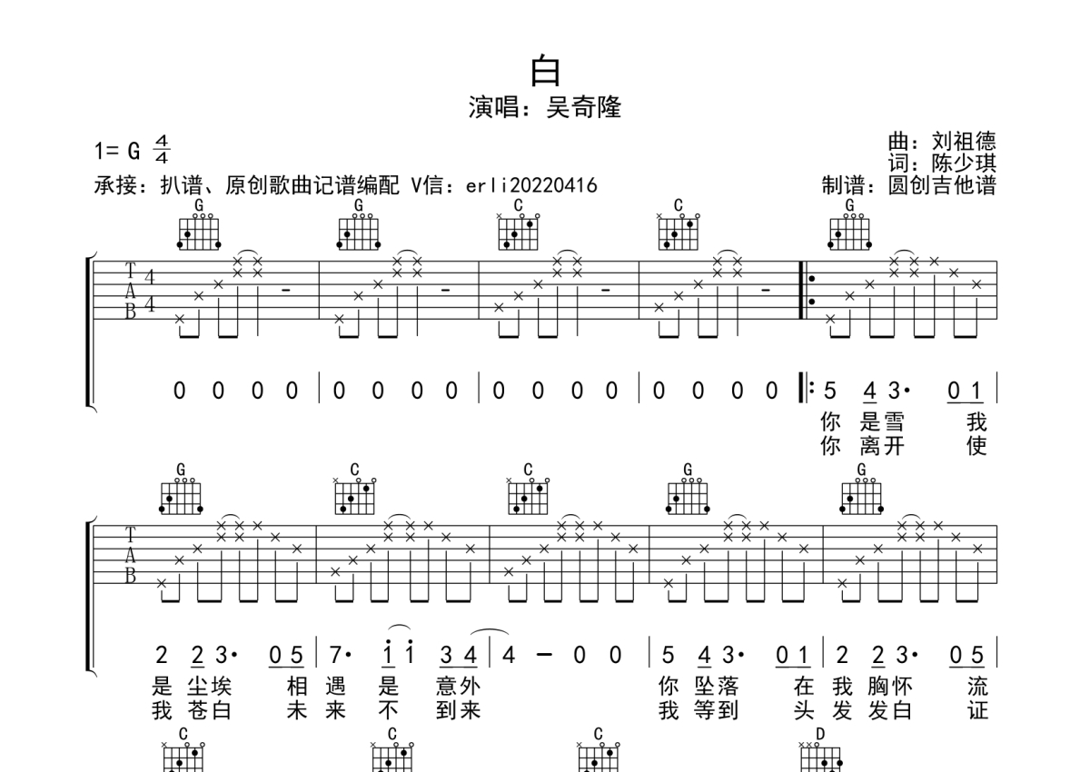 吴奇隆《白》吉他谱 - G调弹唱六线谱 - 分解编配原版编配