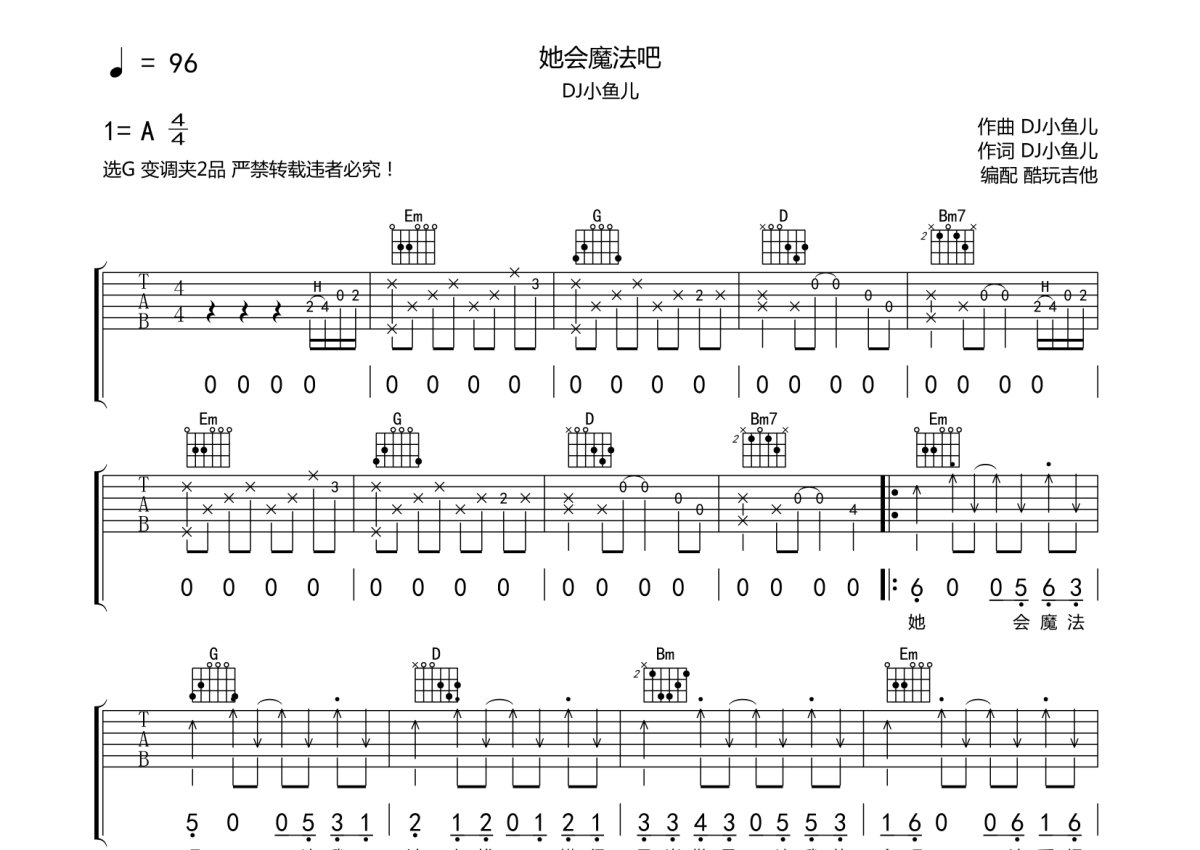 DJ小鱼儿《她会魔法吧》吉他谱 - G调弹唱六线谱