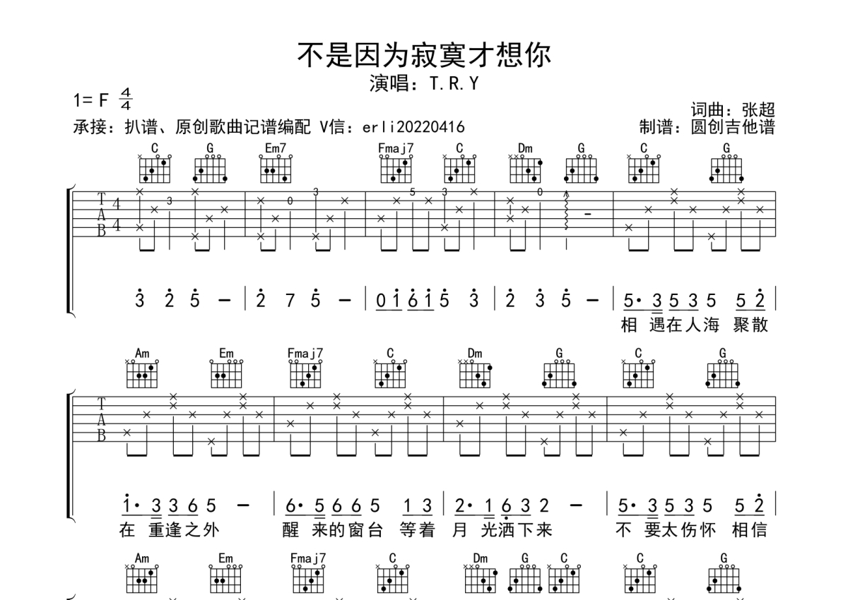 T.R.Y《不是因为寂寞才想你》吉他谱 - C调弹唱六线谱 - 分解加扫弦编配简单编配