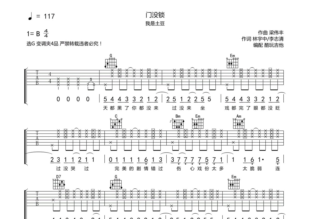 我是土豆/品冠《门没锁》吉他谱 - G调弹唱六线谱