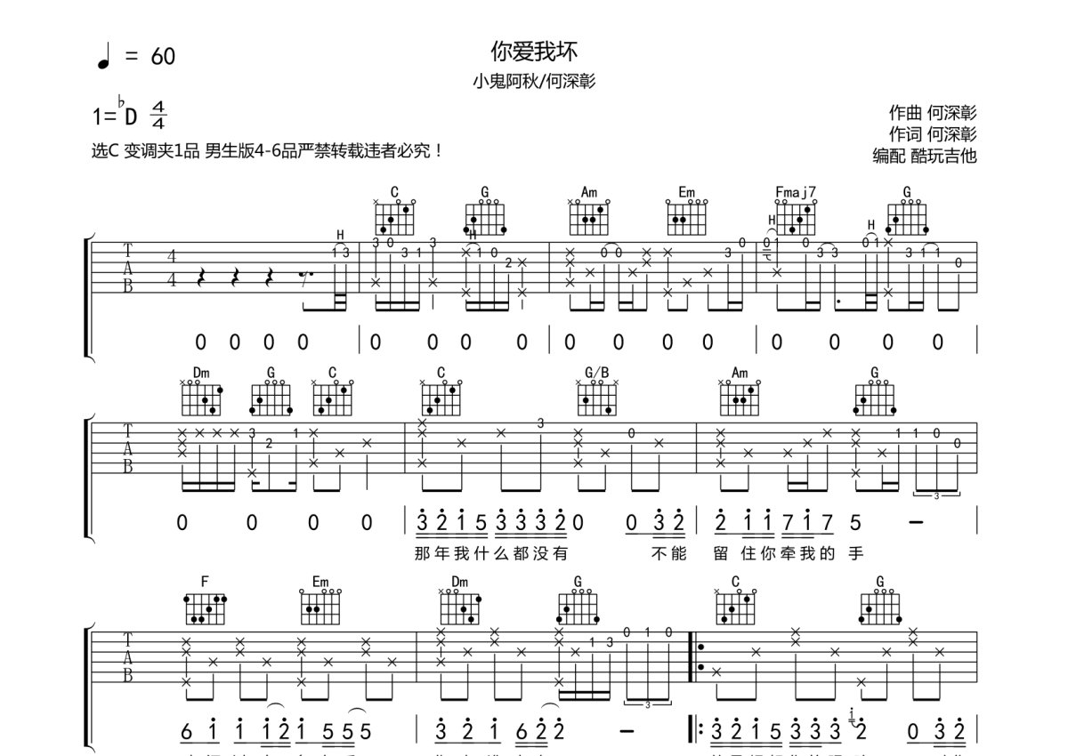 小鬼阿秋/何深彰《你爱我坏》吉他谱 - C调弹唱六线谱