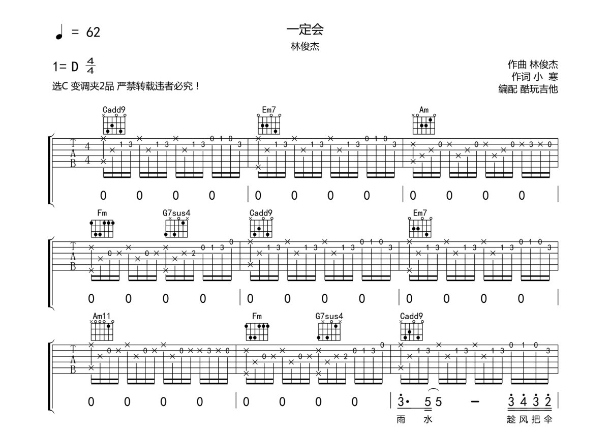 《一定会》是林俊杰演唱的一首歌曲,本吉他谱采用的是C调指法编配,这份吉他谱共有三张高清图谱,图谱由 @酷玩吉他 编配上传,图谱使用六线谱编配,包含吉他和弦指法、简谱以及歌词部分,曲谱配备了相关的音频提供试听,使用这份一定会吉他谱,可以让你更加方便地掌握这首歌曲的弹唱技巧,快来尝试吧。林俊杰《一定会》吉他谱_C调吉他弹唱谱。