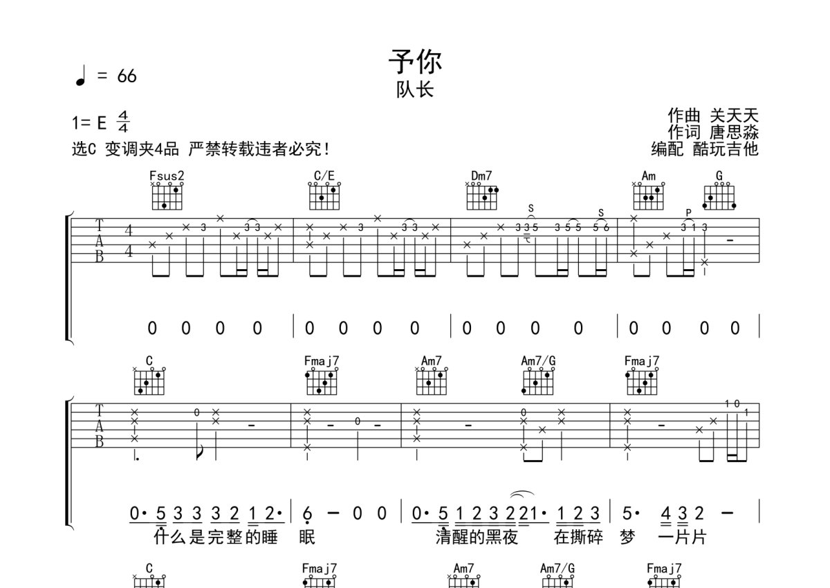 队长《予你》吉他谱 - C调弹唱六线谱