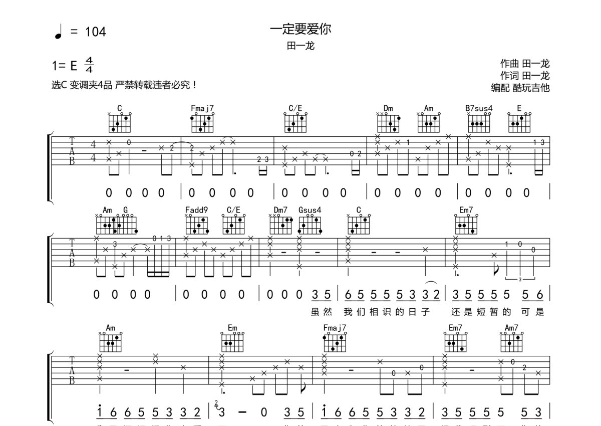 田一龙《一定要爱你》吉他谱 - C调弹唱六线谱