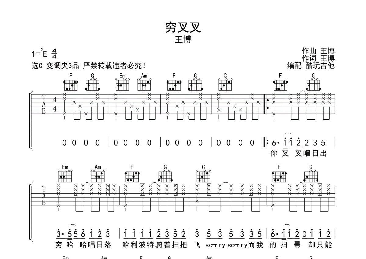 抖音版《穷叉叉》吉他谱 - C调弹唱六线谱