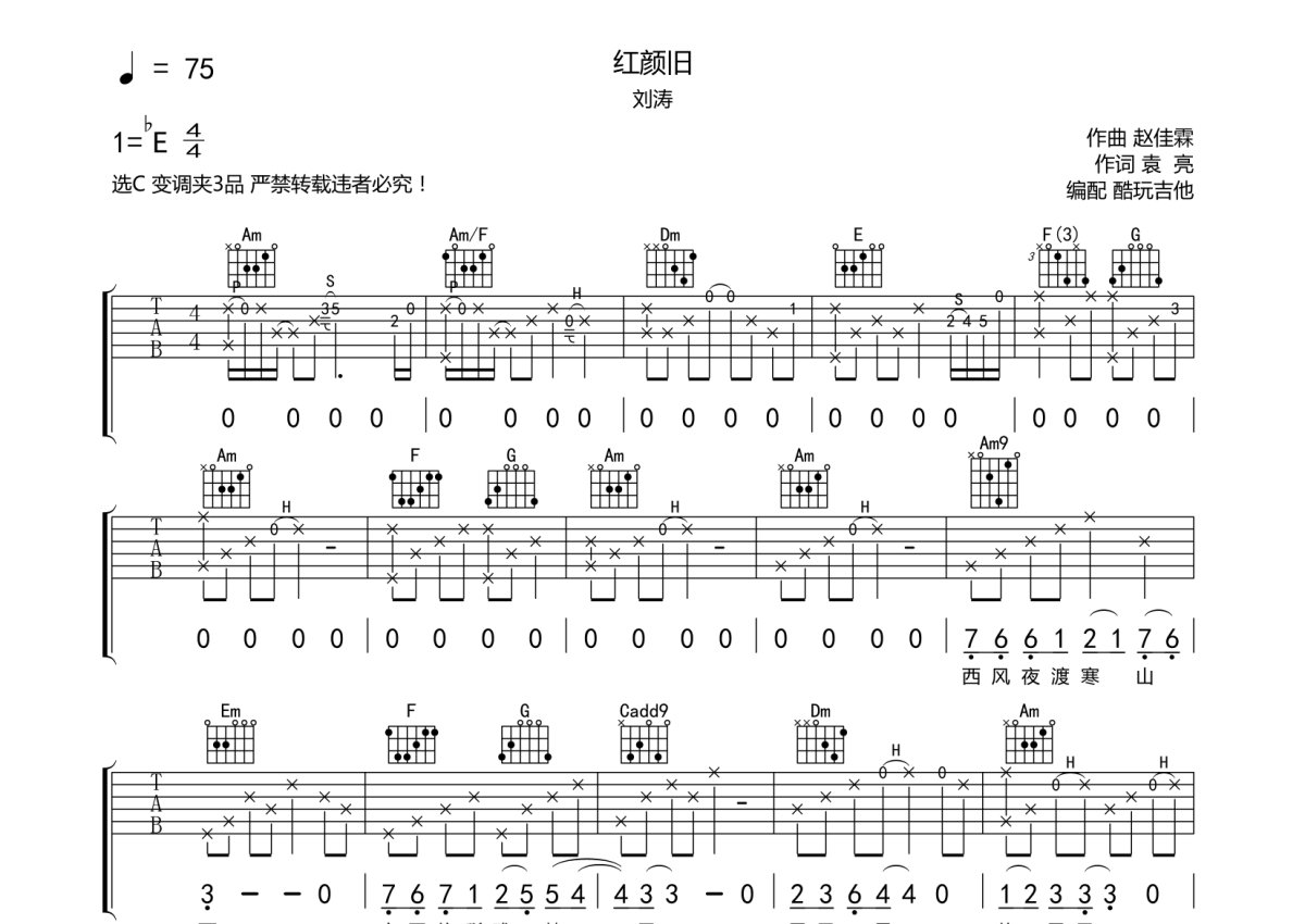 《红颜旧》是刘涛演唱的一首歌曲,本吉他谱采用的是C调指法编配,这份吉他谱共有两张高清图谱,图谱由 @酷玩吉他 编配上传,图谱使用六线谱编配,包含吉他和弦指法、简谱以及歌词部分,曲谱配备了相关的音频提供试听,使用这份红颜旧吉他谱,可以让你更加方便地掌握这首歌曲的弹唱技巧,快来尝试吧。刘涛《红颜旧》吉他谱_C调吉他弹唱谱。