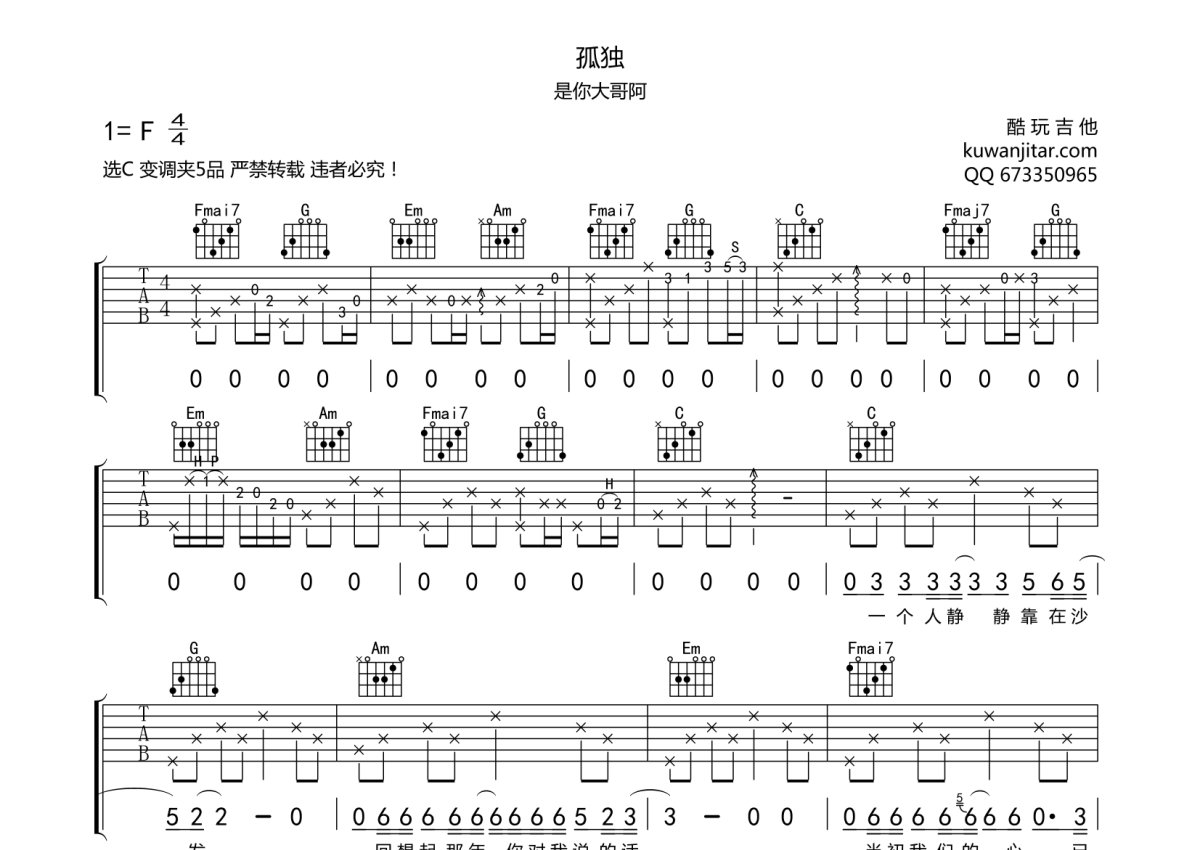 王佳扬《孤独》吉他谱 - C调弹唱六线谱