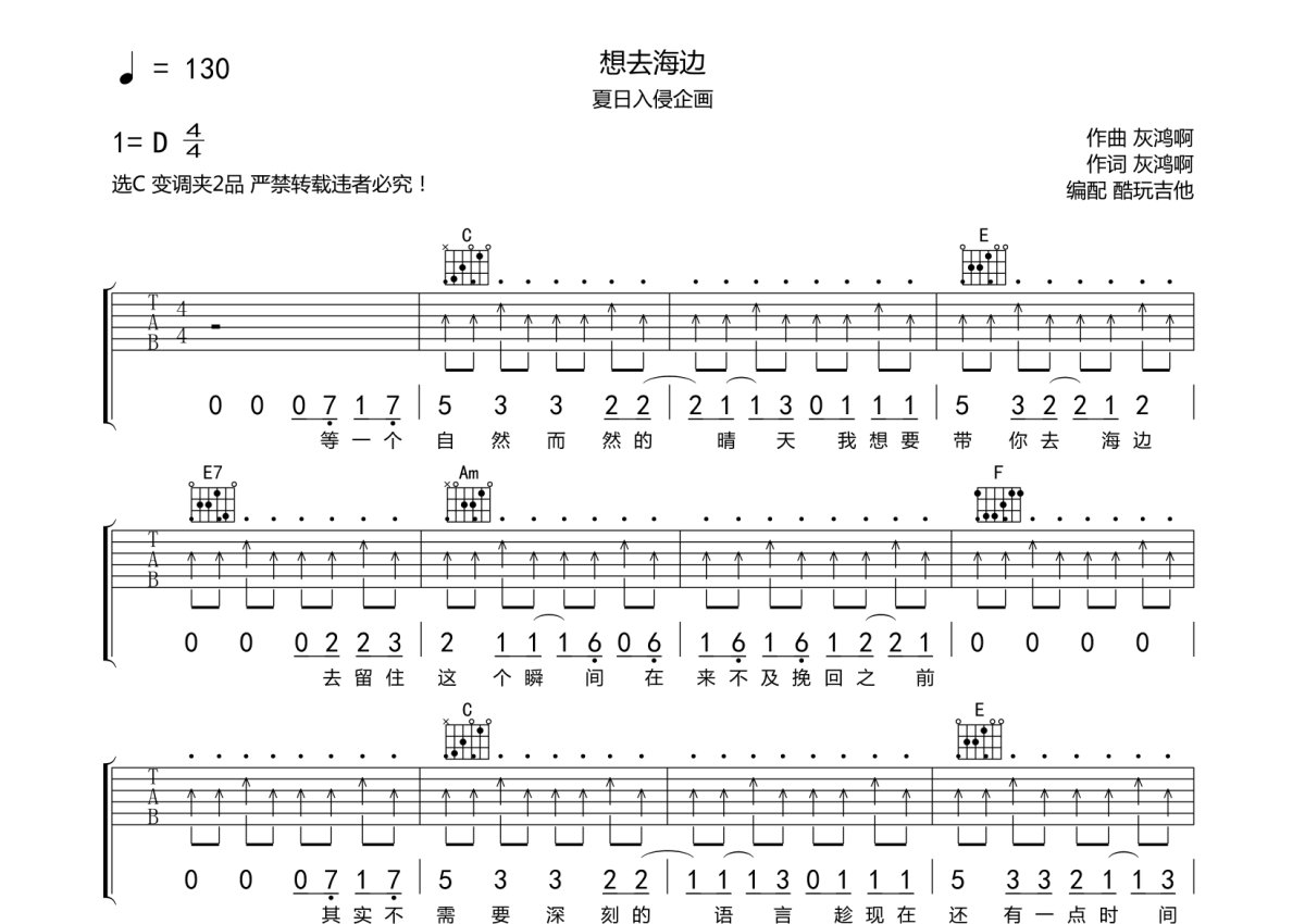 《想去海边》是夏日入侵企画 -演唱的一首歌曲,本吉他谱采用的是C调指法编配,这份吉他谱共有四张高清图谱,图谱由 @酷玩吉他 编配上传,图谱使用六线谱编配,包含吉他和弦指法、简谱以及歌词部分,曲谱配备了相关的音频提供试听,使用这份想去海边吉他谱,可以让你更加方便地掌握这首歌曲的弹唱技巧,快来尝试吧。夏日入侵企画 -《想去海边》吉他谱_C调吉他弹唱谱。