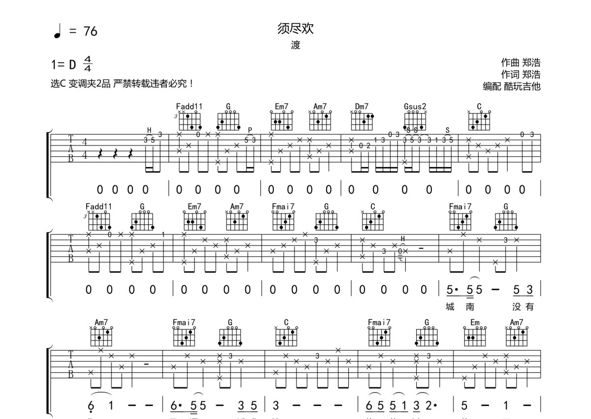 渡《须尽欢》吉他谱 - C调弹唱六线谱