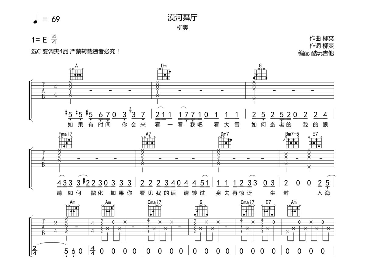《漠河舞厅》是刘爽演唱的一首歌曲,本吉他谱采用的是C调指法编配,这份吉他谱共有四张高清图谱,图谱由 @酷玩吉他 编配上传,图谱使用六线谱编配,包含吉他和弦指法、简谱以及歌词部分,曲谱配备了相关的音频提供试听,使用这份漠河舞厅吉他谱,可以让你更加方便地掌握这首歌曲的弹唱技巧,快来尝试吧。刘爽《漠河舞厅》吉他谱_C调吉他弹唱谱。