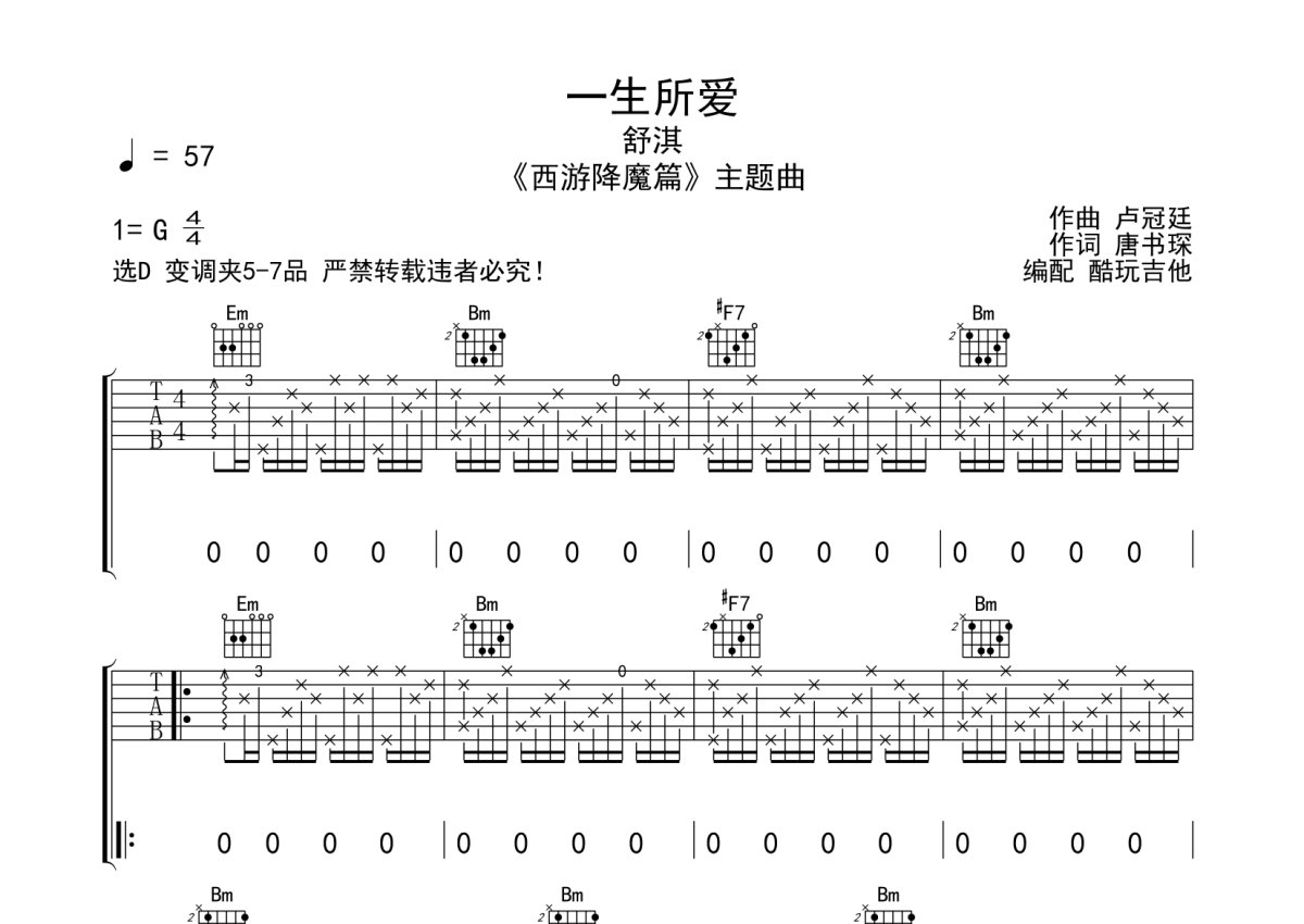 《一生所爱》是舒淇演唱的一首歌曲,本吉他谱采用的是D调指法编配,这份吉他谱共有两张高清图谱,图谱由 @酷玩吉他 编配上传,图谱使用六线谱编配,包含吉他和弦指法、简谱以及歌词部分,曲谱配备了相关的音频提供试听,使用这份一生所爱吉他谱,可以让你更加方便地掌握这首歌曲的弹唱技巧,快来尝试吧。舒淇《一生所爱》吉他谱_D调吉他弹唱谱。