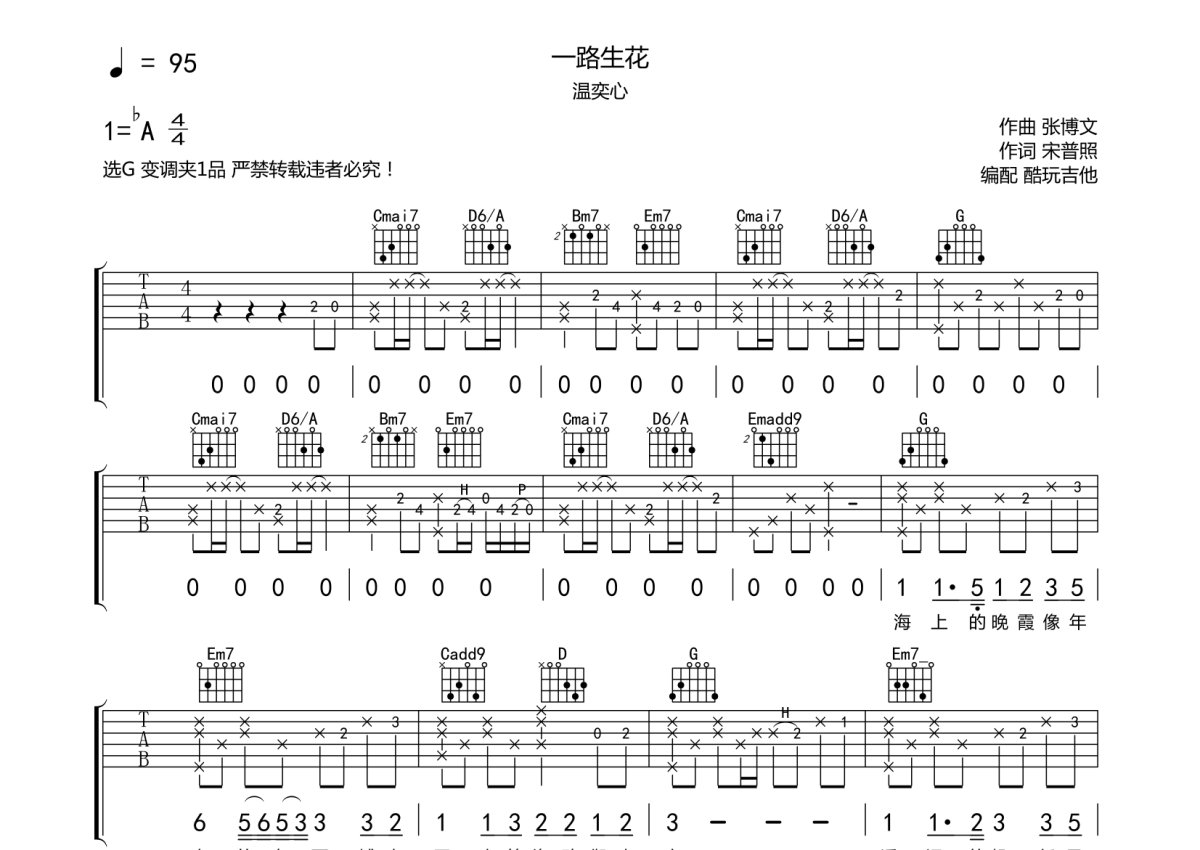 温奕心《一路生花》吉他谱 - G调弹唱六线谱