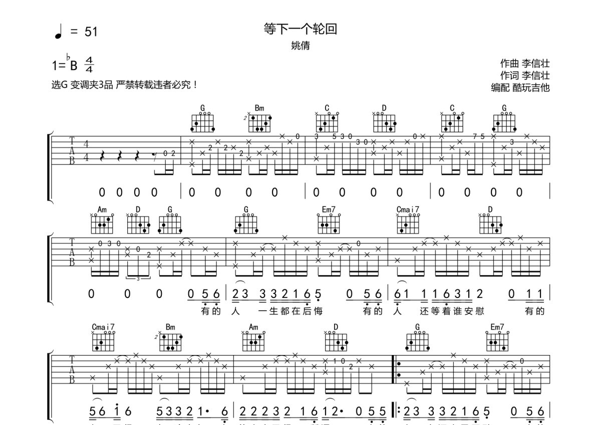 姚倩《等下一个轮回》吉他谱 - G调弹唱六线谱