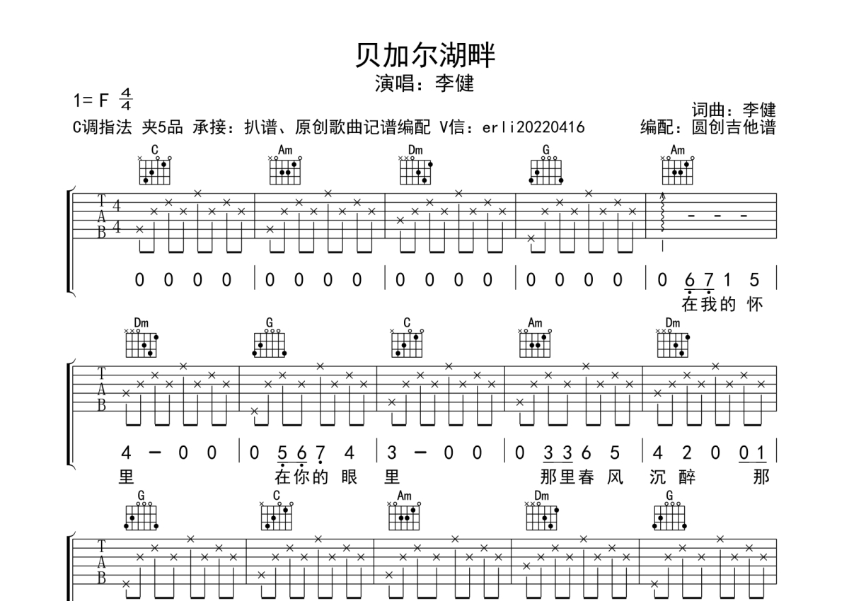 李健《贝加尔湖畔》吉他谱 - C调弹唱六线谱 - 分解加扫弦编配