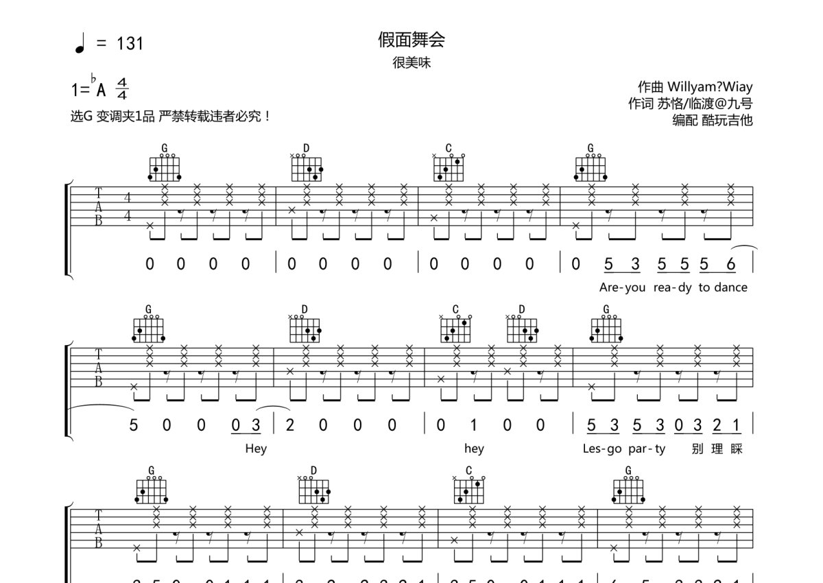 很美味《假面舞会》吉他谱 - G调弹唱六线谱