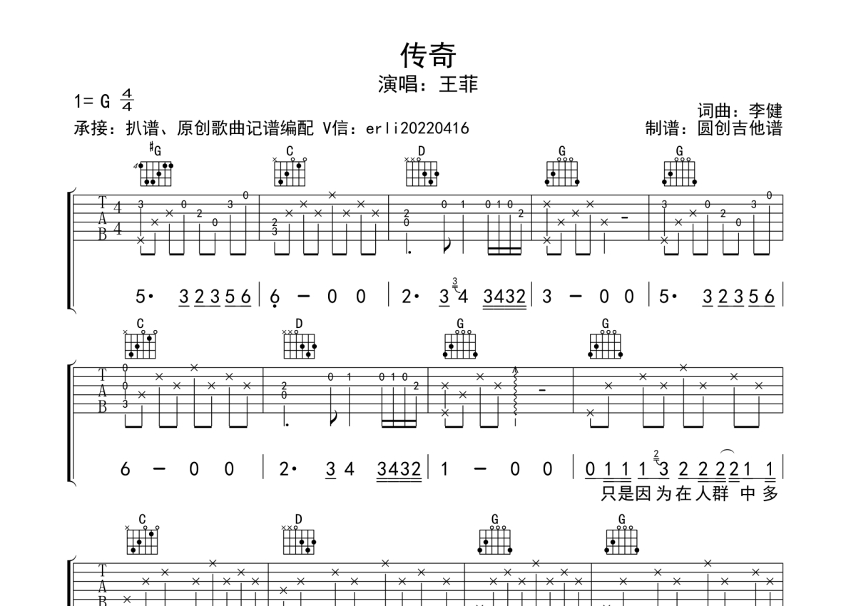 王菲《传奇》吉他谱 - G调弹唱六线谱 - 分解加扫弦编配