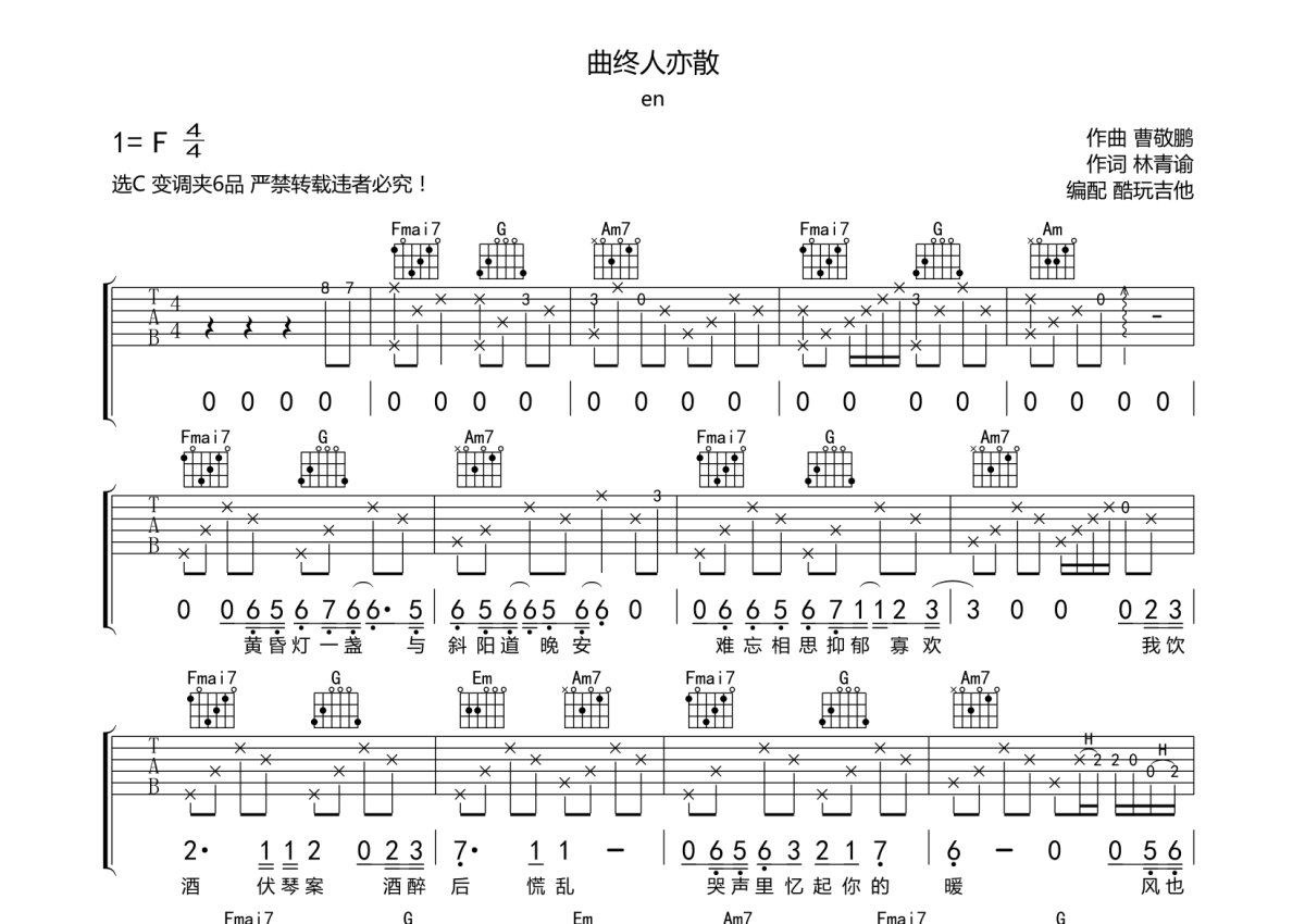 en《曲终人亦散》吉他谱 - C调弹唱六线谱