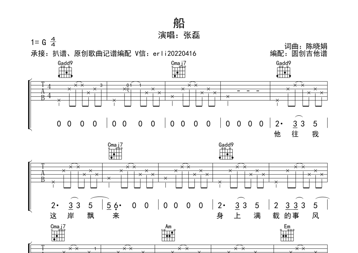 张磊《船》吉他谱 - G调弹唱六线谱 - 分解节奏型简单编配