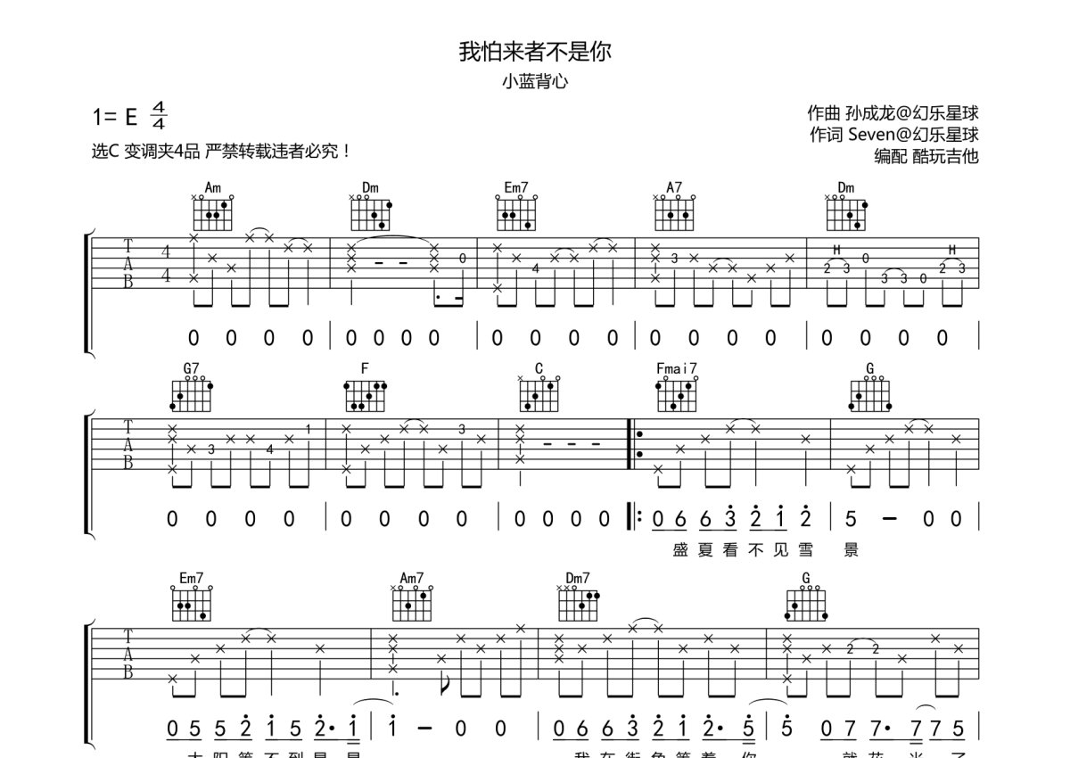 《我怕来者不是你》是小蓝背心演唱的一首歌曲,本吉他谱采用的是C调指法编配,这份吉他谱共有两张高清图谱,图谱由 @酷玩吉他 编配上传,图谱使用六线谱编配,包含吉他和弦指法、简谱以及歌词部分,曲谱配备了相关的音频提供试听,使用这份我怕来者不是你吉他谱,可以让你更加方便地掌握这首歌曲的弹唱技巧,快来尝试吧。小蓝背心《我怕来者不是你》吉他谱_C调吉他弹唱谱。