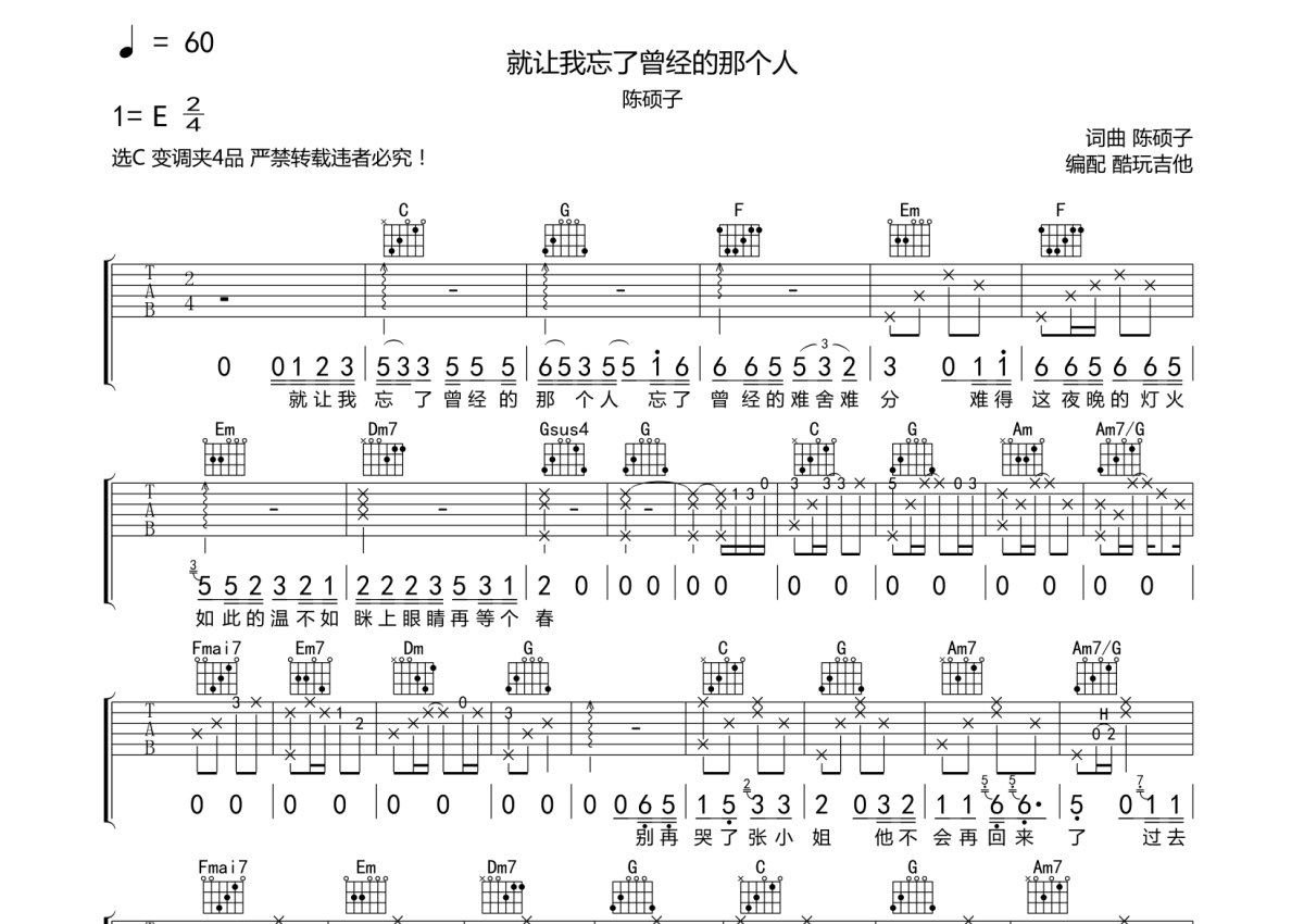陈硕子《就让我忘了曾经的那个人》吉他谱 - C调弹唱六线谱