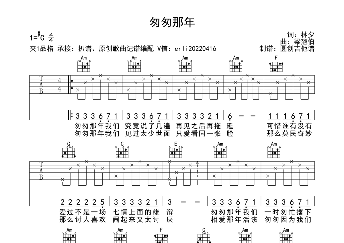《匆匆那年》是王菲演唱的一首歌曲,本吉他谱采用的是C调指法编配,这份吉他谱共有三张高清图谱,图谱由 @圆创吉他谱 编配上传,图谱使用六线谱编配,包含吉他和弦指法、简谱以及歌词部分,使用这份匆匆那年吉他谱,可以让你更加方便地掌握这首歌曲的弹唱技巧,快来尝试吧。经典歌曲 C调指法编配 适合所有吉他弹出爱好者。